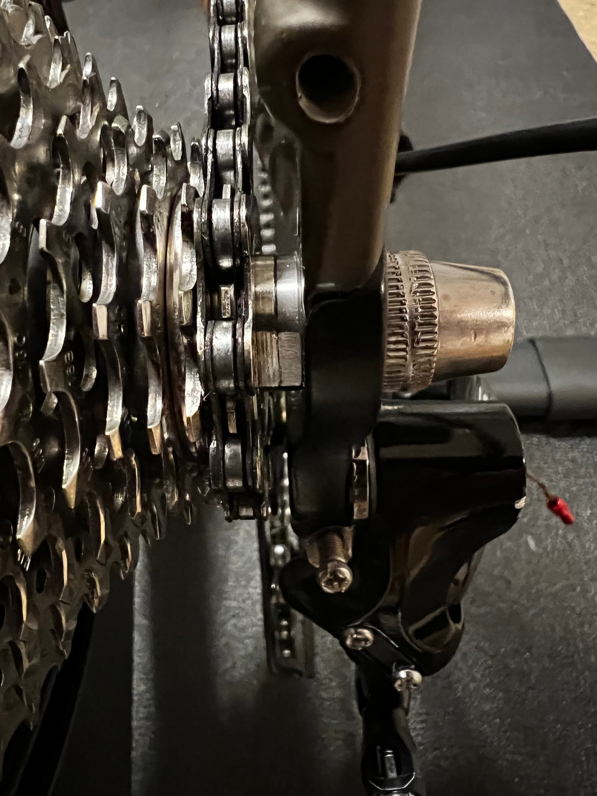 - The ~5 mm gap you measured between your smallest cog on the wheel and the inside face of the dropout is wider than normal. Like, enormous to my eye. That extra long axle end may have been spec’ed to accommodate the unusual hanger design.