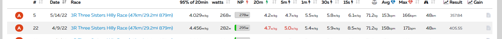 There’s something here I have yet to figure out. Winnable… After a couple years of finishing at the bottom of A, what is a person winning by taking a podium spot in B, C, D when these are essentially power-based categories? Age and gender I can understand (which makes it that much more frustrating that results can’t be sorted by age in ZP).