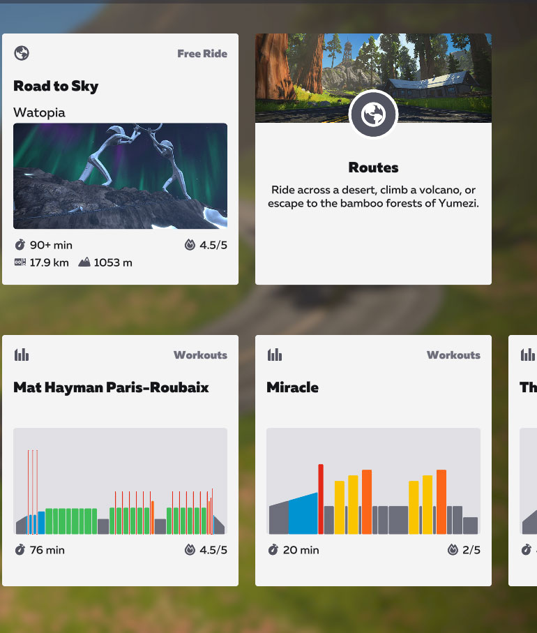 I would like to be able to see the same visuals when choosing a workout route similar to when viewing routes in the main “world” tab. I don’t always remember which routes go where, what climbs are included, etc.