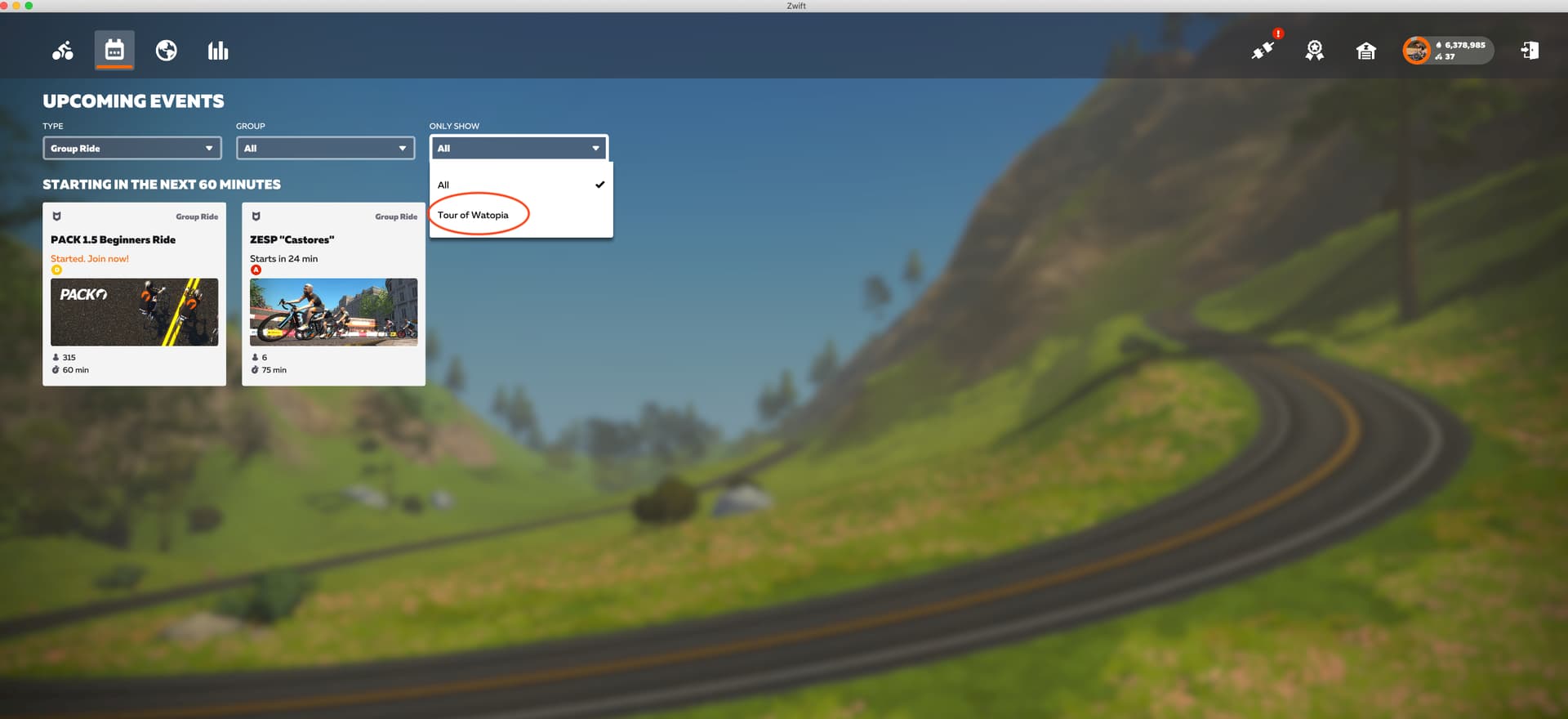 The “ONLY SHOW” drop down shows “All” or “Tour of Watopia”