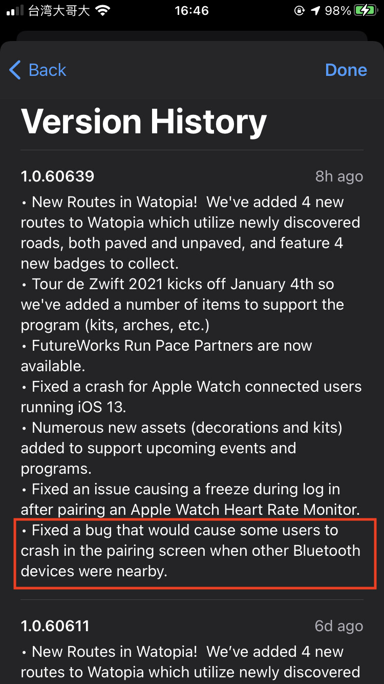 FYI⦠my iPhone updated to Zwift version 1.0.60639 this afternoon via autoupdate. This thread was originally for 1.0.60239 which was four versions or ~2weeks ago. So check your version numbers and update accordingly.